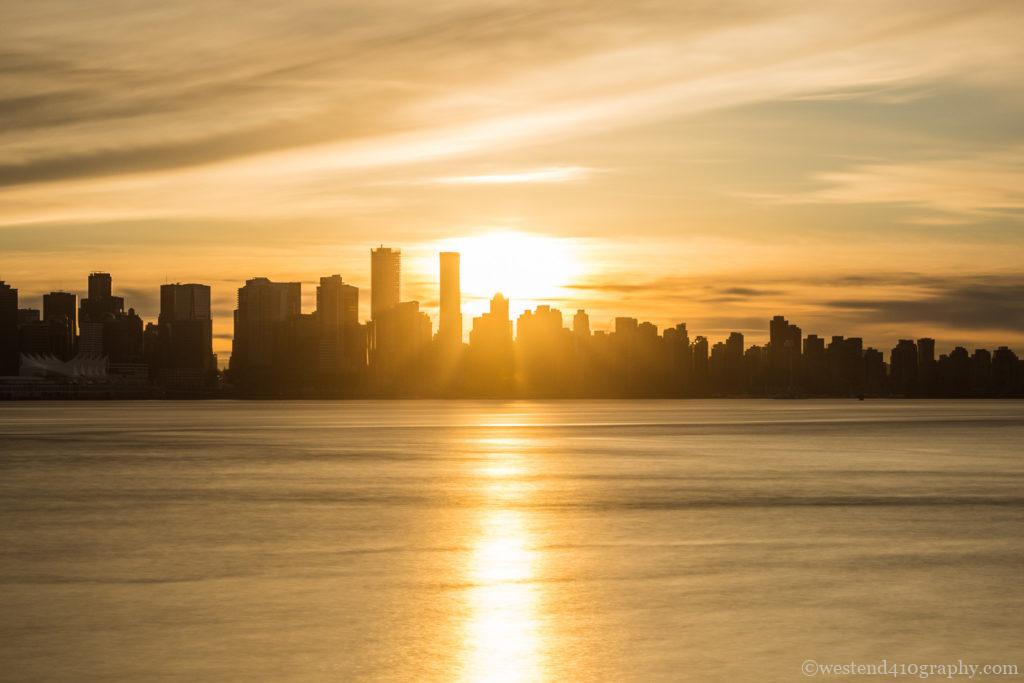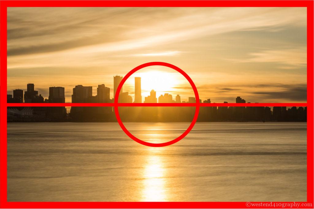 上の作例では対岸の港沿いに立ち並ぶビルを境目に空と海を二分割構図で配置することで、日の丸構図で中央に配置した夕日の他に、左右への広がりを感じる写真に仕上げることができました。