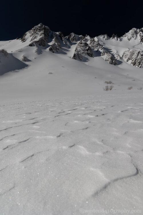 強風が吹く雪山などでは風によって削られた雪の造形が、まるで波や模様のように現れる風紋(シュカブラ)を雪景色として撮ることができます。