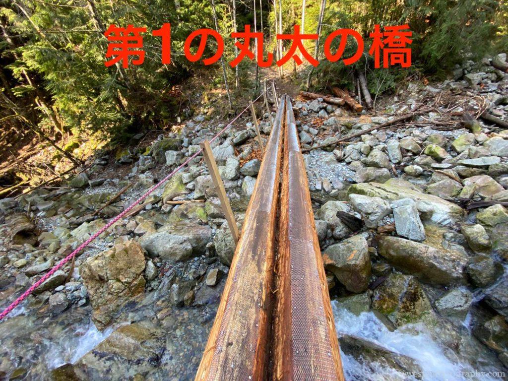 丸太の橋は十分な太さと手すり代わりのロープが張られていますが、滑って渓流に落ちないように気をつけましょう。